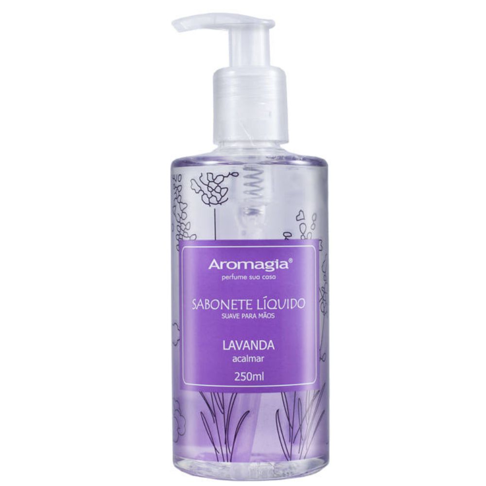 Aromagia Sabonete Liquido Lavanda 250ml Limpa as mãos com suavidade e delicadeza, promovendo hidratação da pele. Seu aroma, por ser intenso, perfuma as mãos e o ambiente em que foi usado.