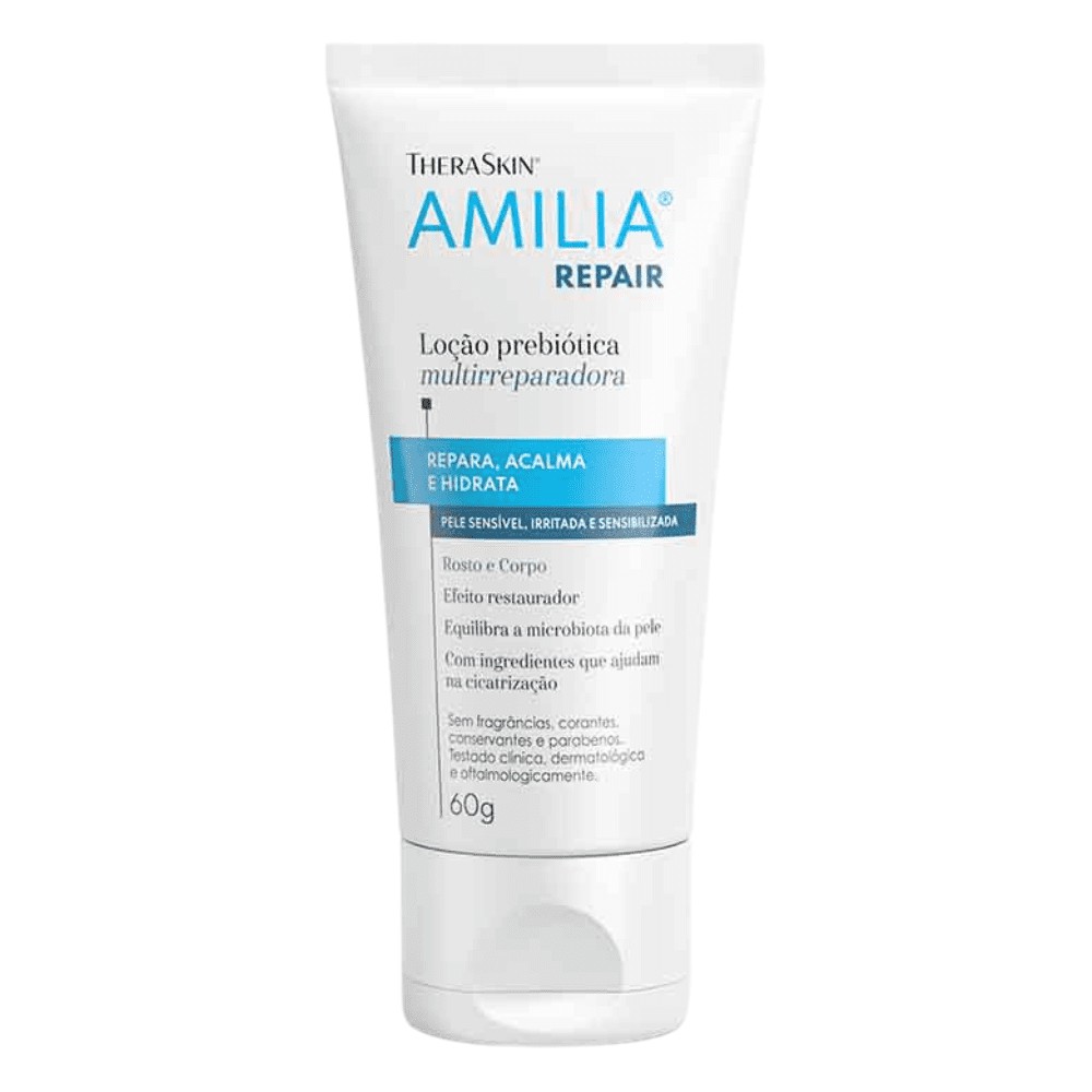 Theraskin Amilia Repair Loção Prebiotica 60g Com ação anti-inflamatória, Amilia Repair restaura a pele sensível irritada e sensibilizada, reparando os sintomas de vermelhidão, coceira e sensação de calor através da ação da niacinamida com o bisabolol.